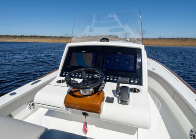 The Valhalla V-28 Bay helm offers premium equipment choices, including dual 19″ MFDs or a single 24″ MFD from Garmin and Simrad. It also features backlit labeled Bocatech switches, a durable fiberglass helm pod, a convenient port glove box with a 12V and USB outlet, and paddle switches on the steering column for jack plate and engine trim control. Optional enhancements like a hardtop or stand-on console 2nd station helm for sight fishing are available.