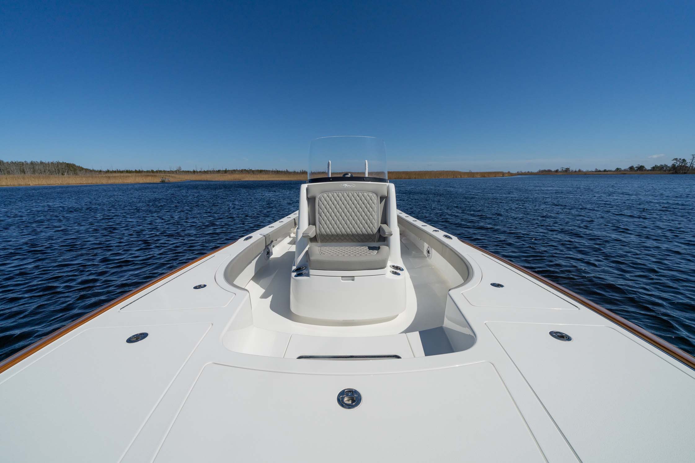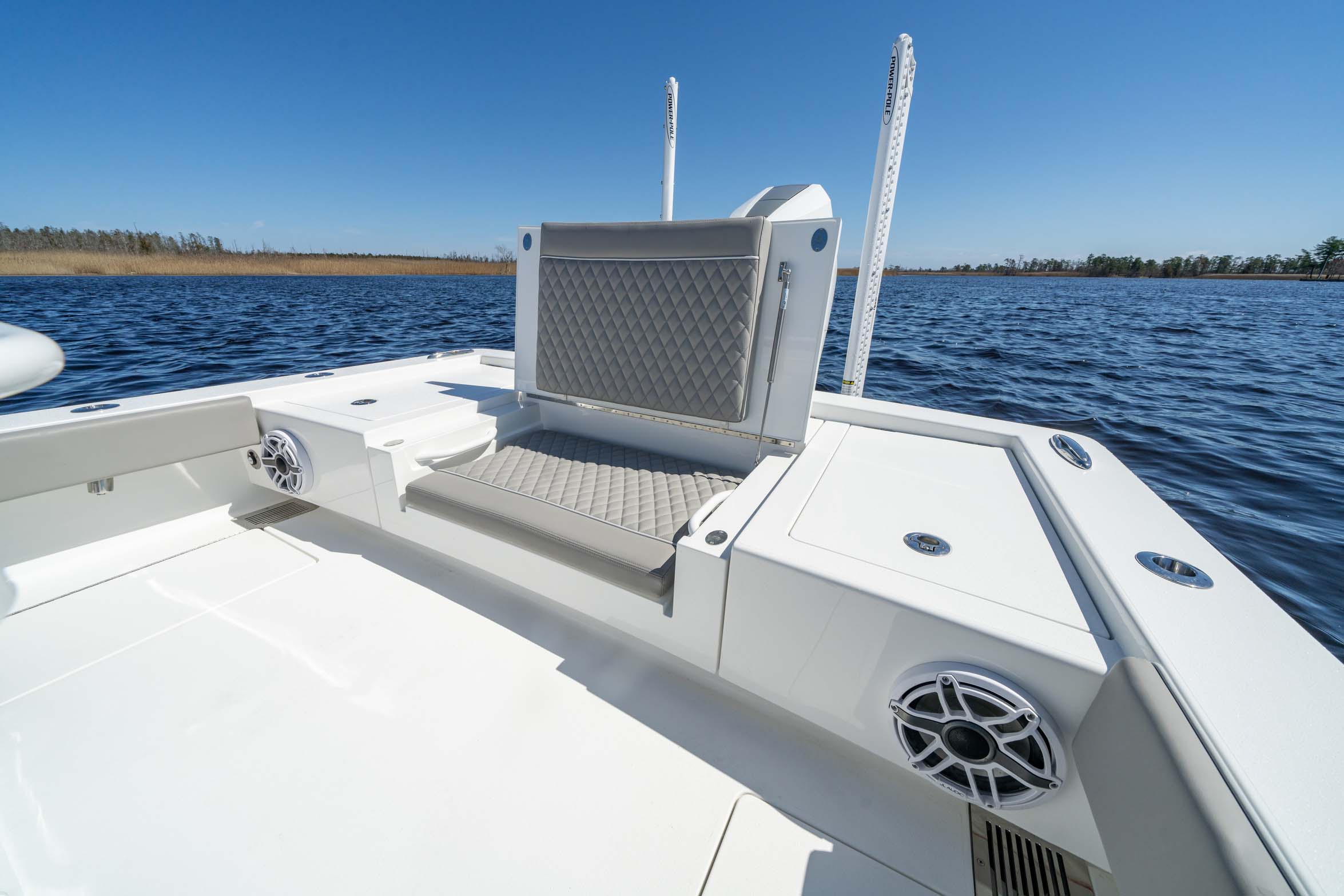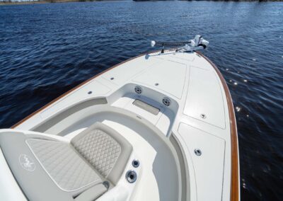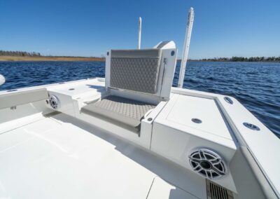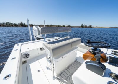 When it comes to seating, the V-28 gives you a range of options to choose from. You can enjoy a flip-up bench seat on the aft casting deck, a leaning post or helm seat module, and a console seat. And for added comfort on the bow casting deck, you have the choice to add seat cushions and teak backrests.