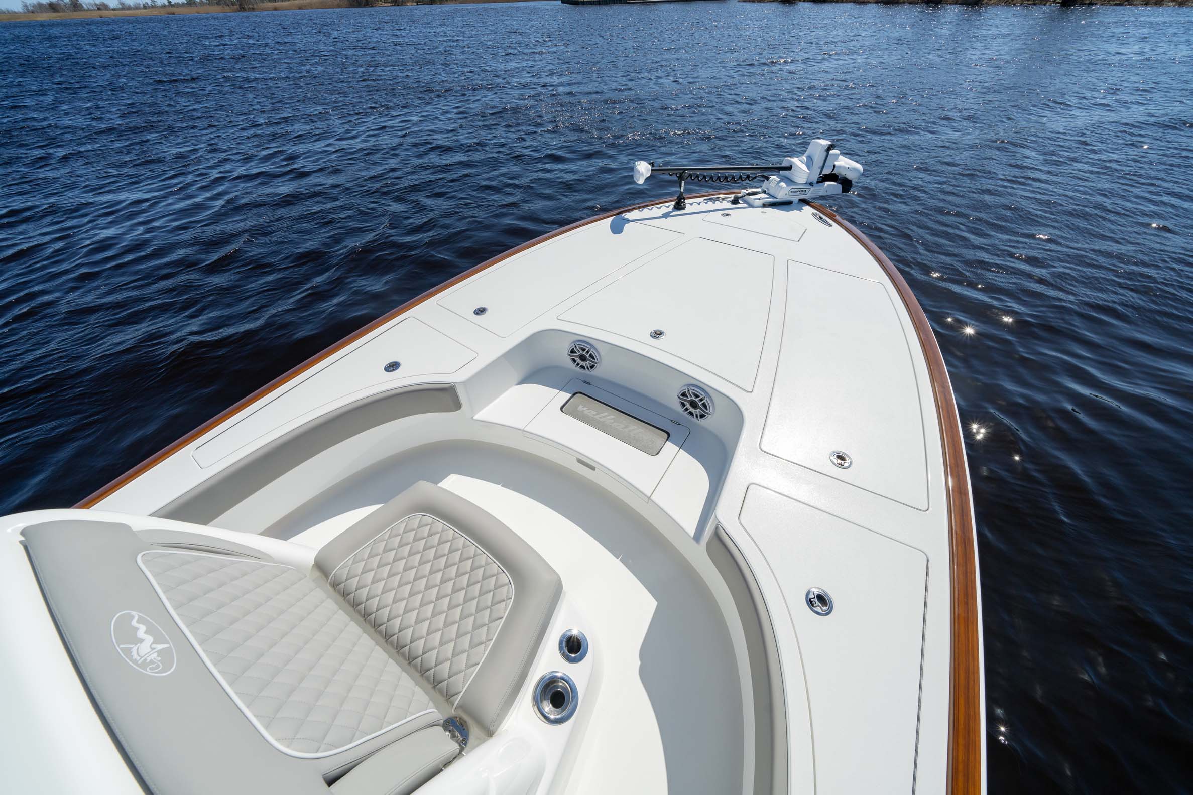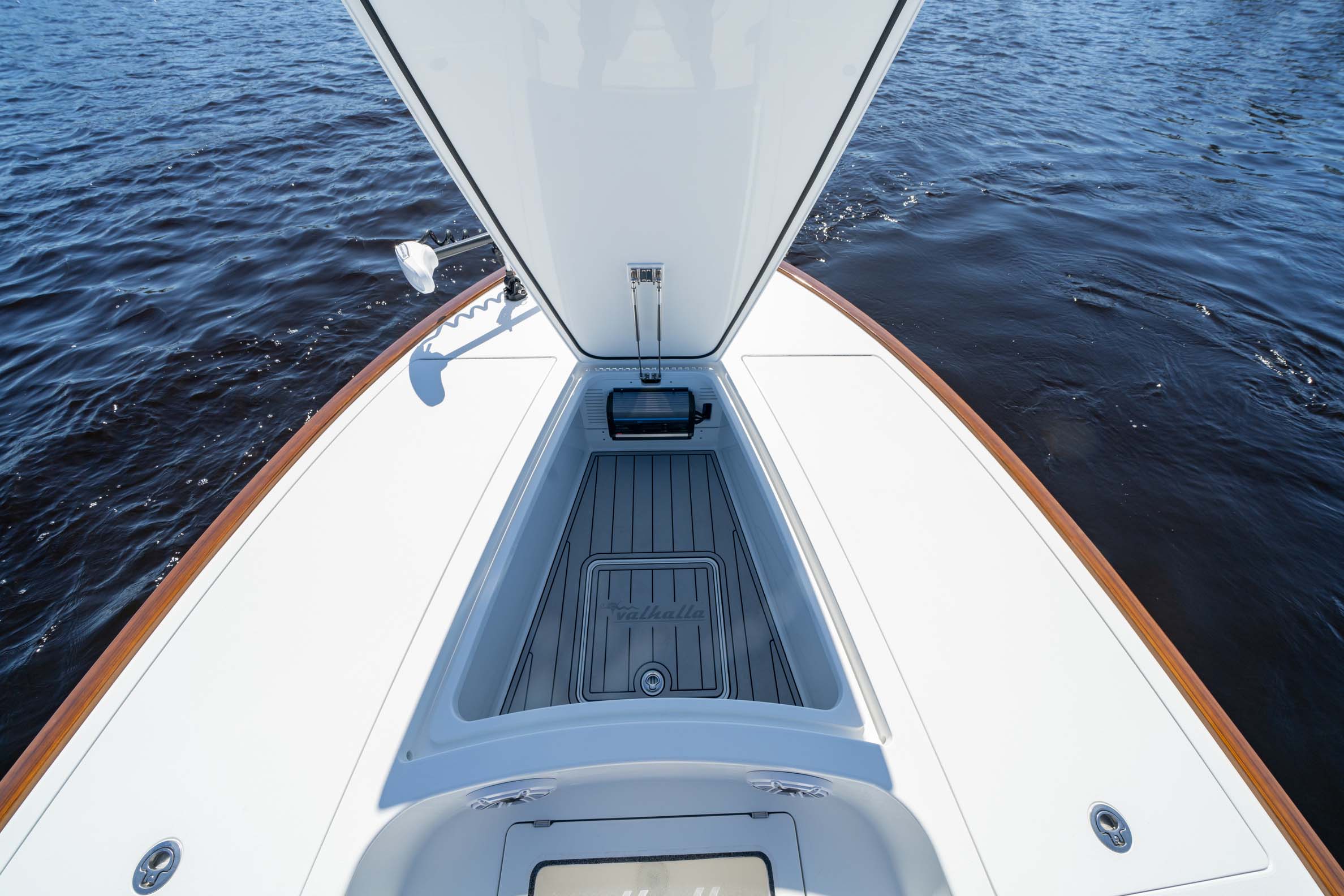 The Valhalla V-28 Bay accommodates top-quality 36V trolling motors from Minn Kota, Power Pole, Rhodan, and Garmin. Opting for the trolling motor package includes a 60ah lithium battery for extended fishing time and reduced weight, with easy access via a dedicated compartment under the deck.