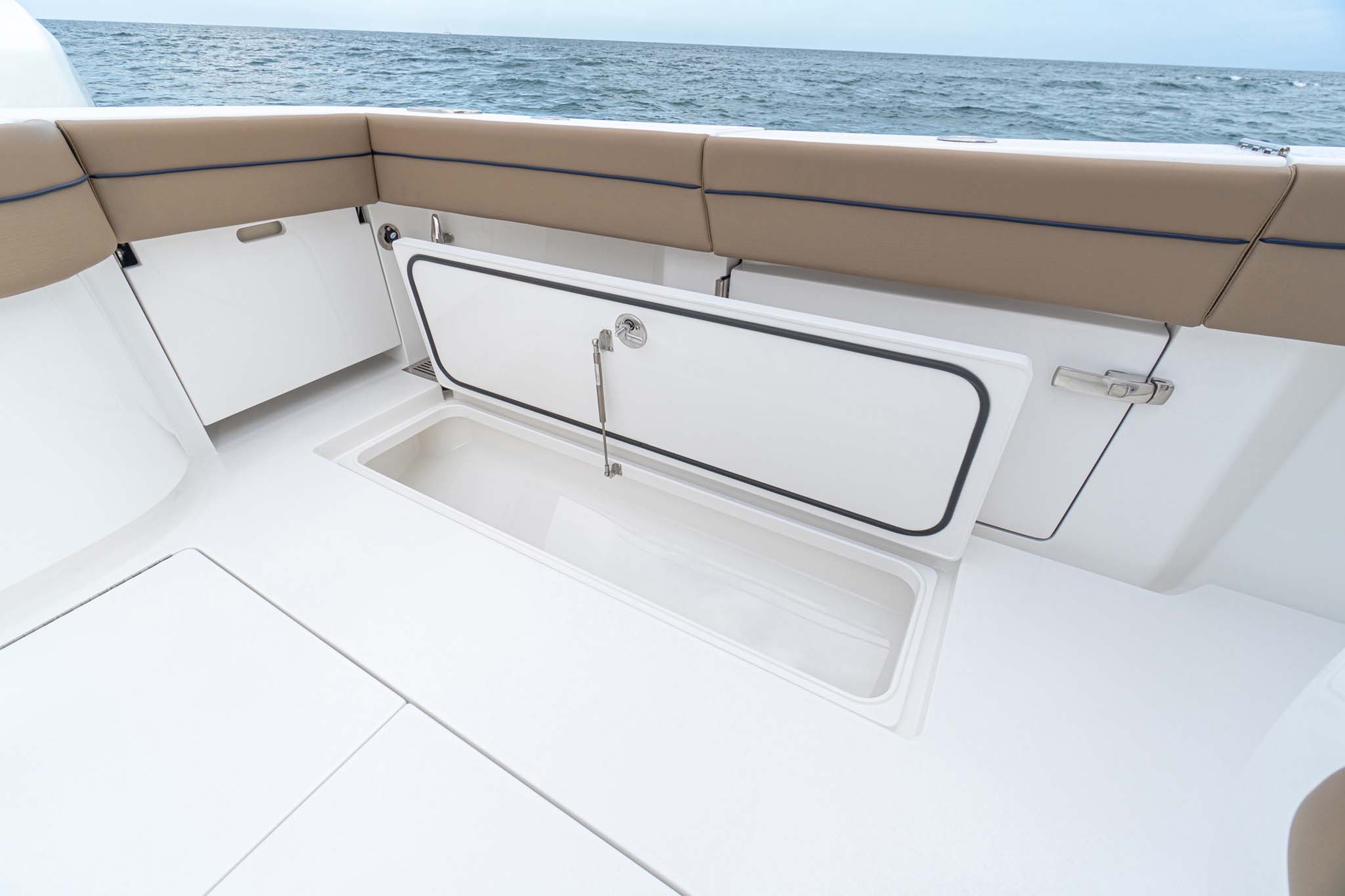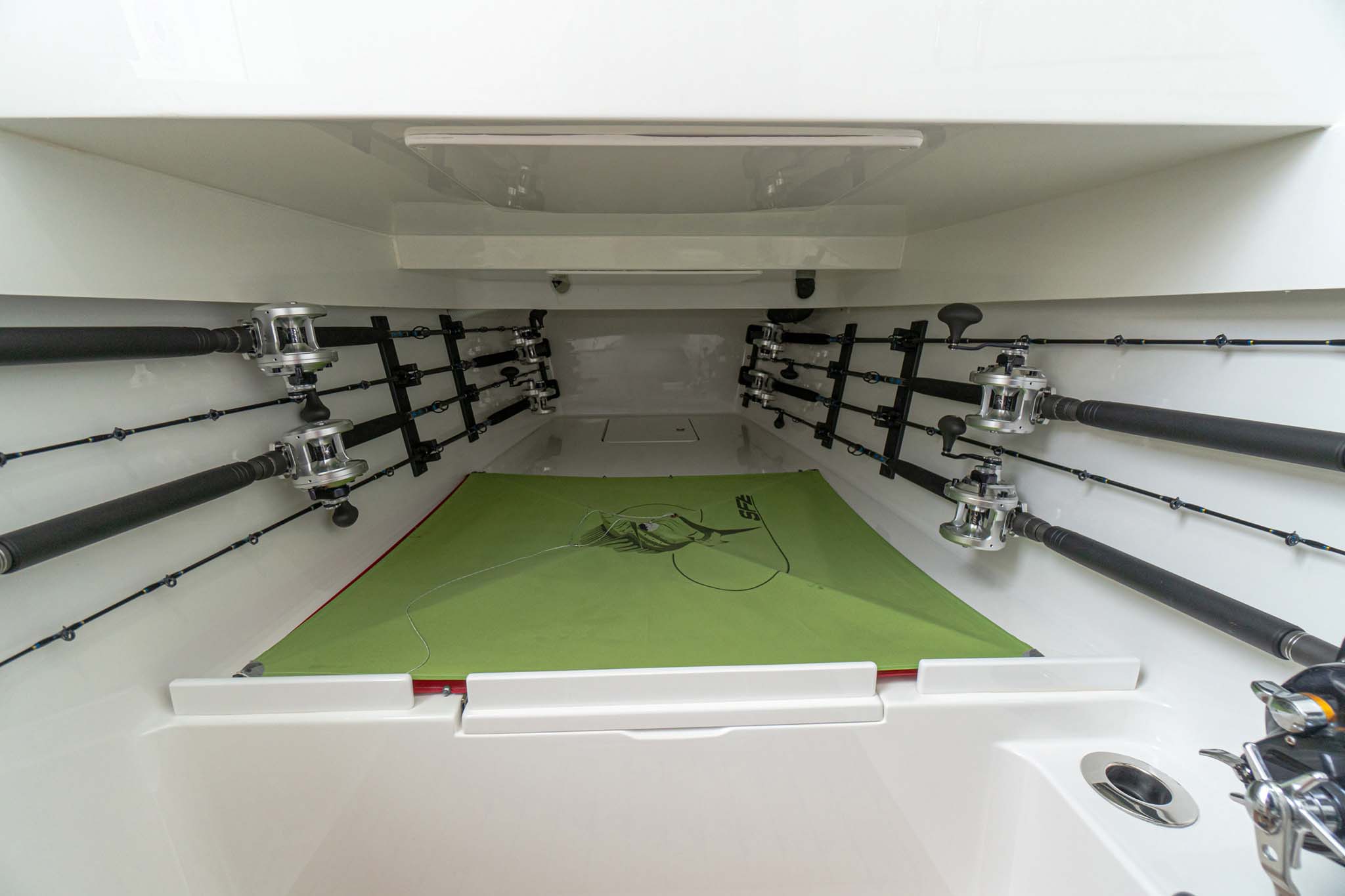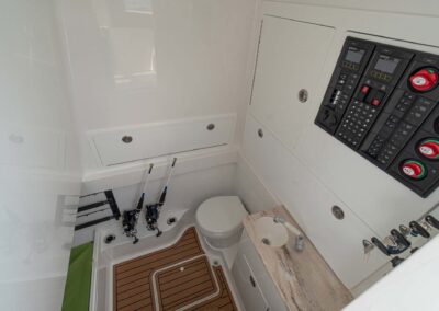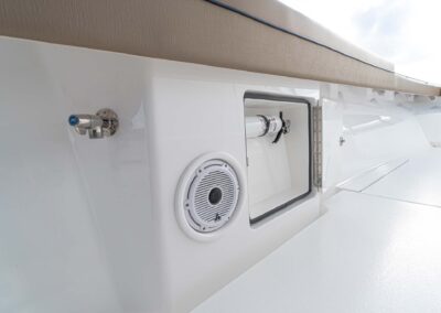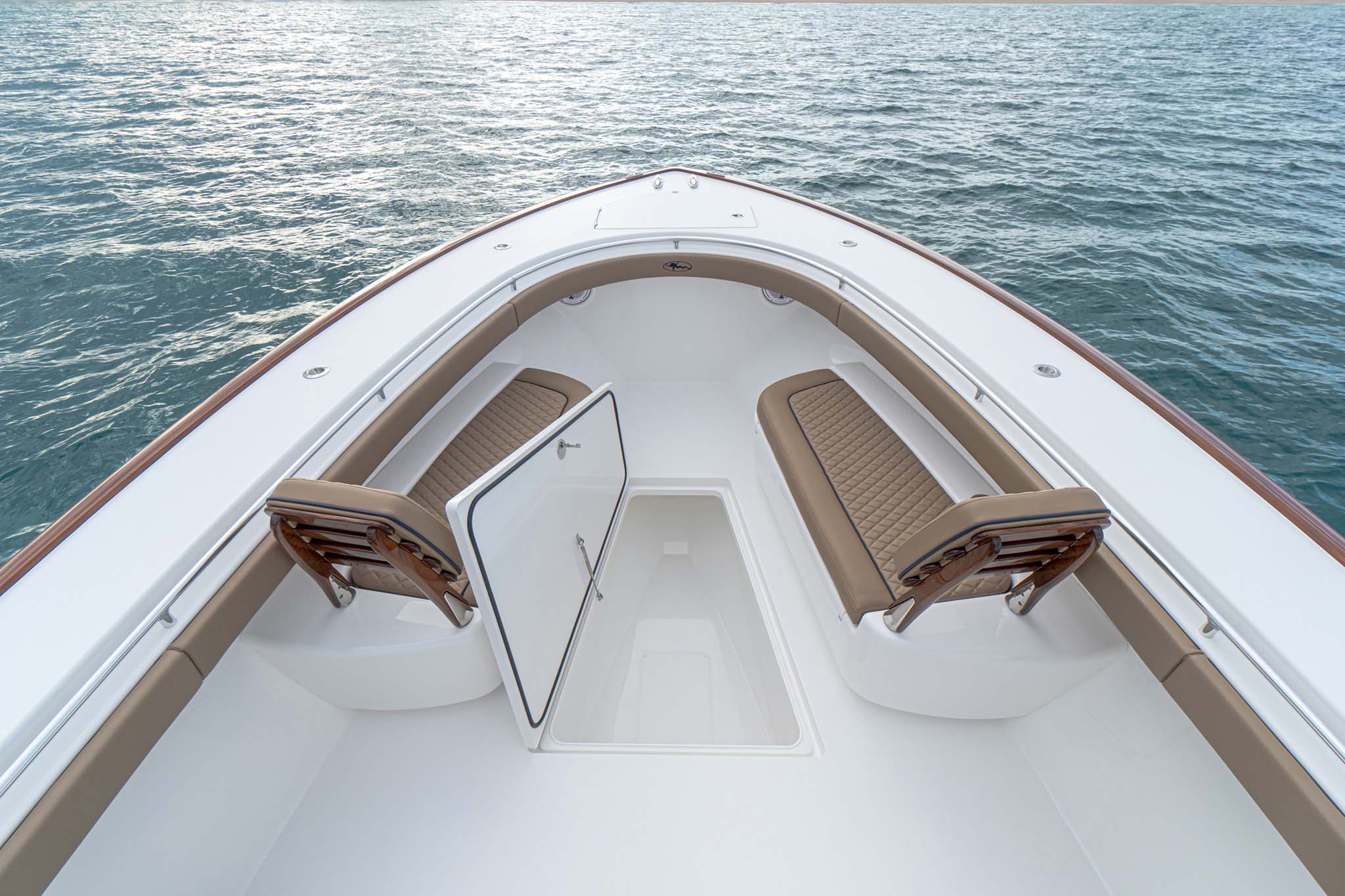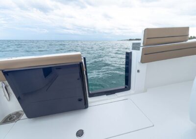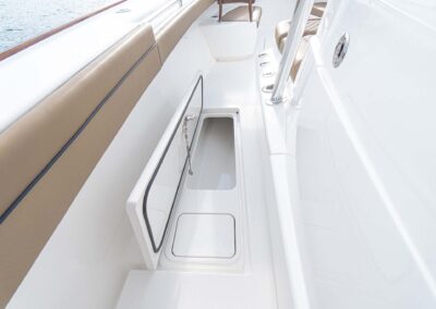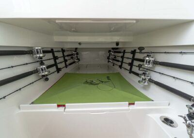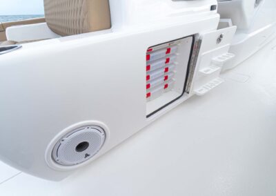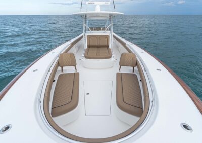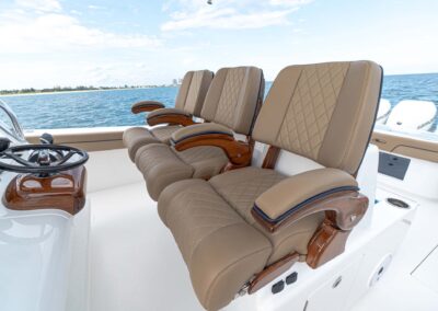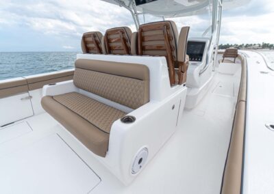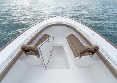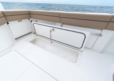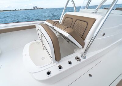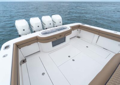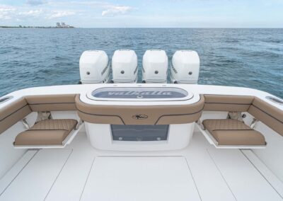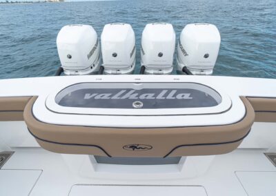 While the V-41 Valhalla is undoubtedly a fishing machine, it also offers a luxurious experience as a tender or sport cruiser. Its deck layout options include an aft mezzanine seating module with armrests and an insulated cooler or live well beneath the seat. Forward seating with backrests, an anchor windlass, a port-side dive door, and additional cup holders make for comfortable day cruising.