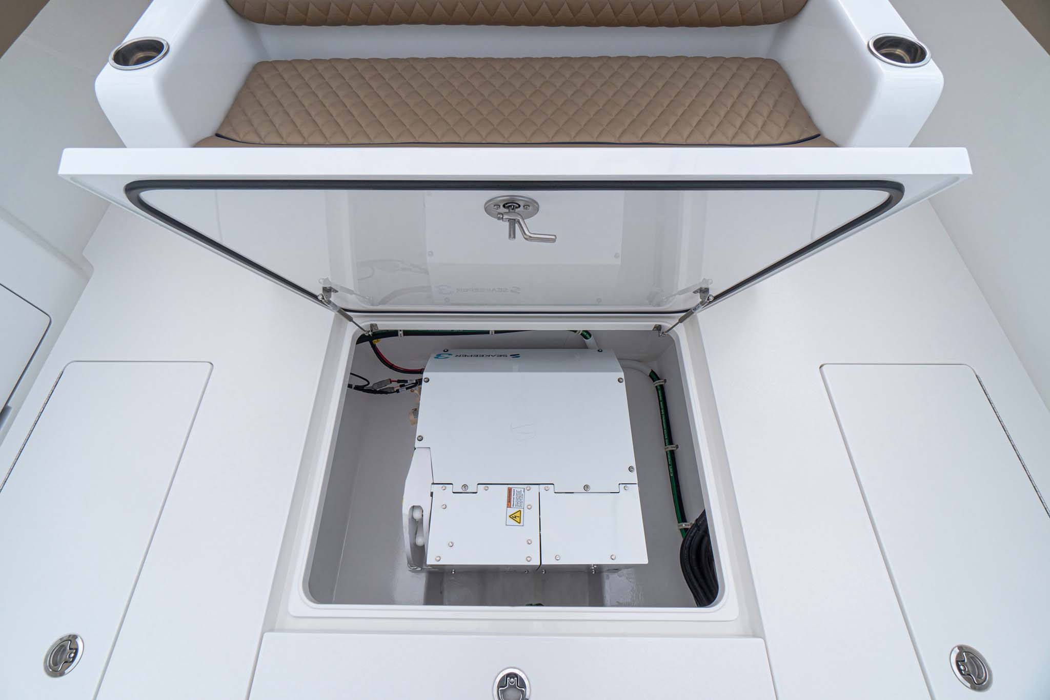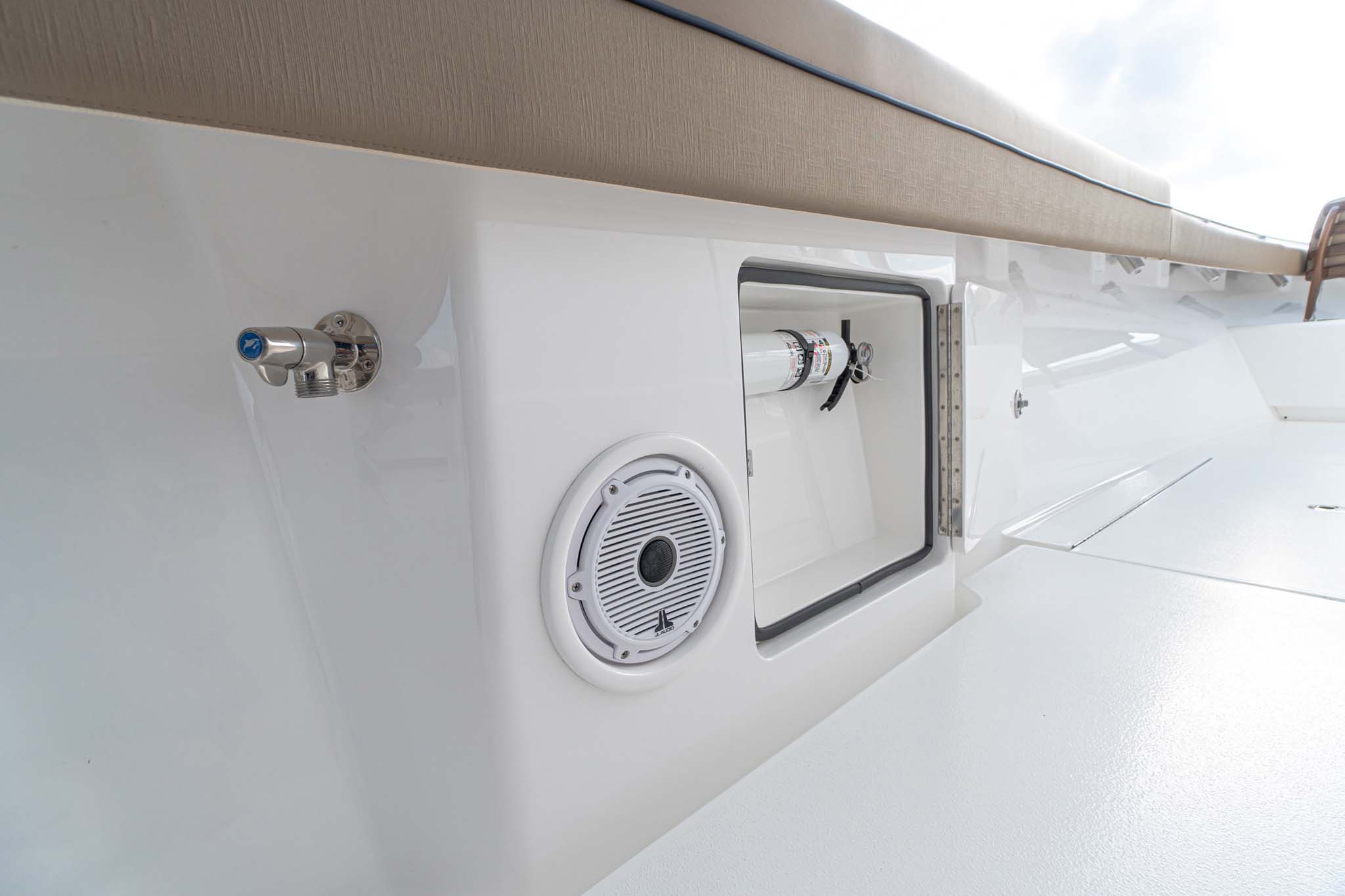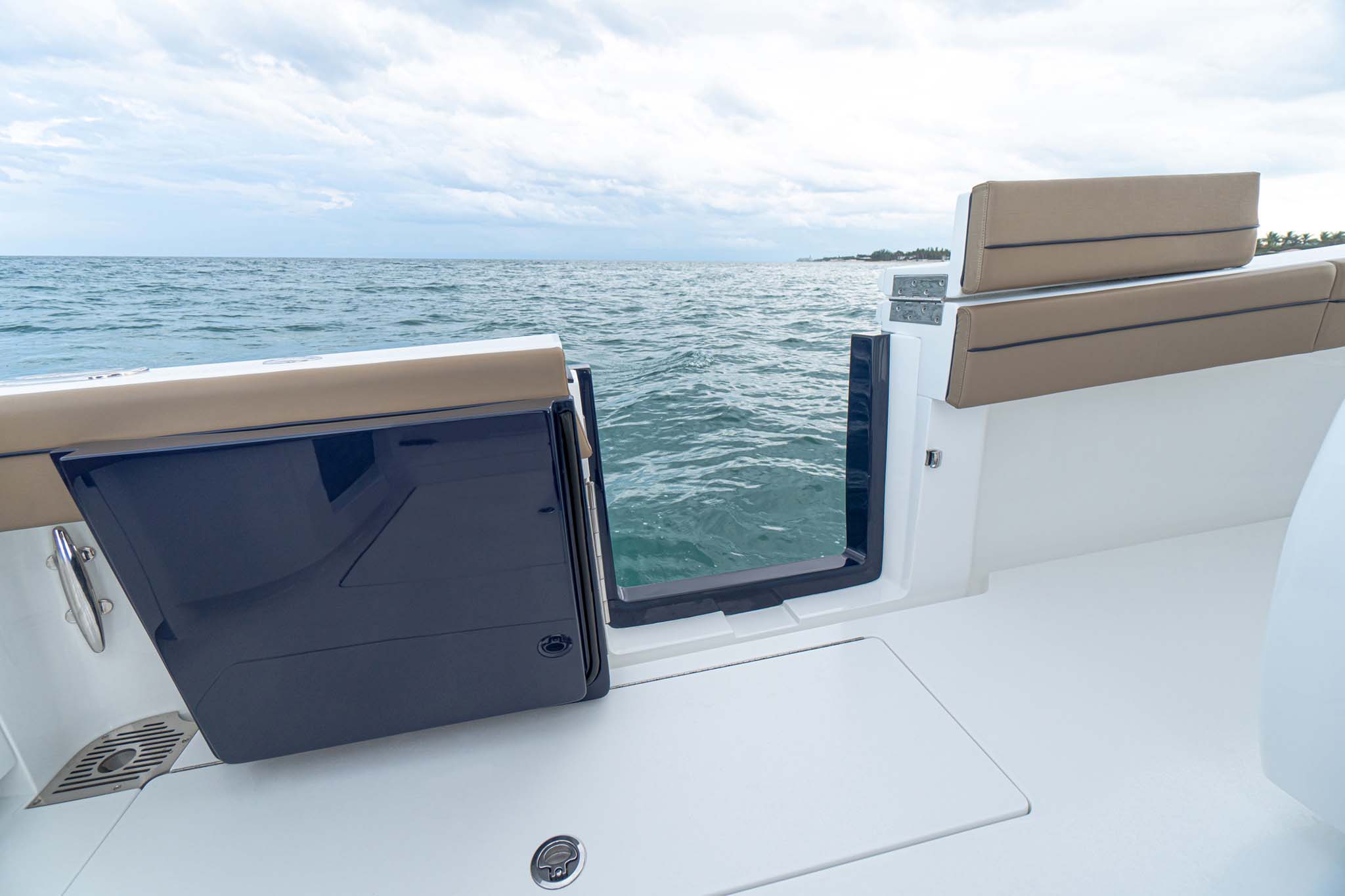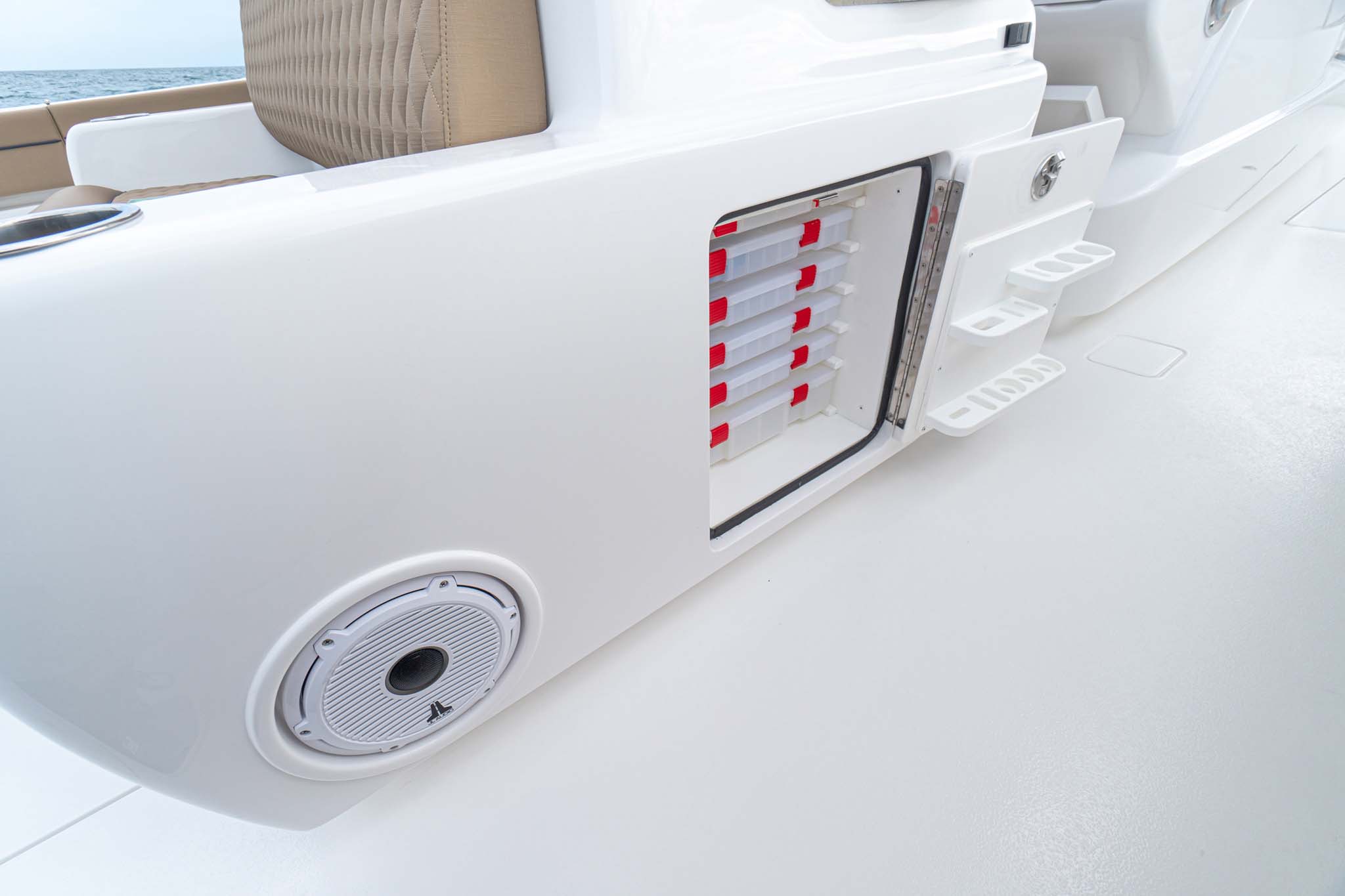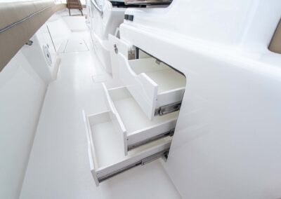 While the V-41 Valhalla is undoubtedly a fishing machine, it also offers a luxurious experience as a tender or sport cruiser. Its deck layout options include an aft mezzanine seating module with armrests and an insulated cooler or live well beneath the seat. Forward seating with backrests, an anchor windlass, a port-side dive door, and additional cup holders make for comfortable day cruising.