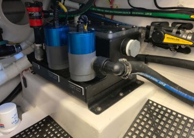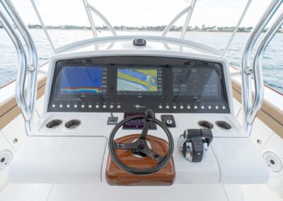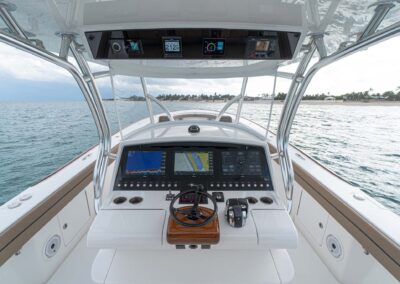 Palm Beach Towers, a Viking subsidiary, offers V-41 Valhalla owners the ability to customize their tower with a custom hardtop, upper helm station, and specialized features like recessed teaser reels and kite boxes. Owners have the flexibility to create their dream tower with custom control options.