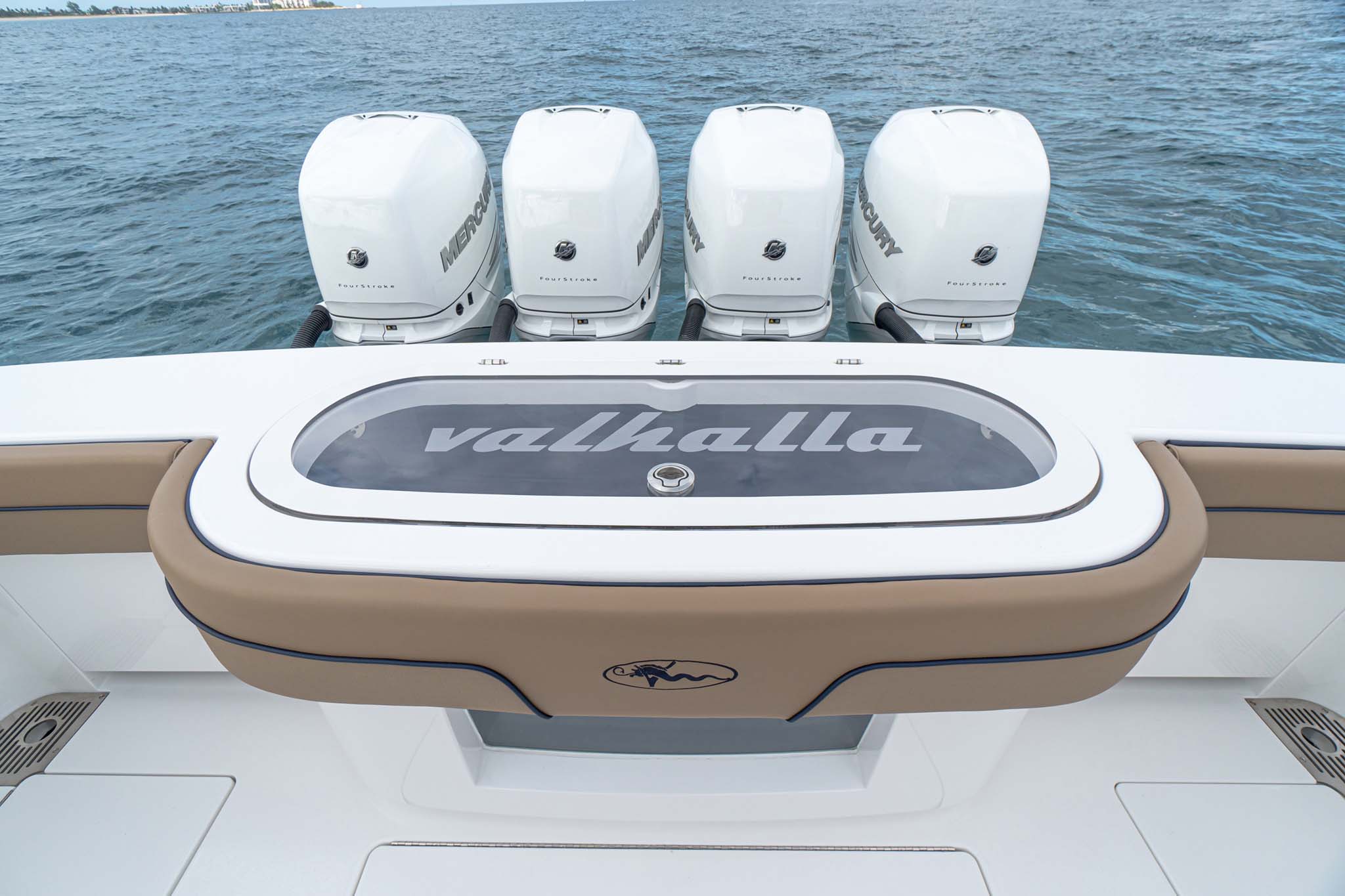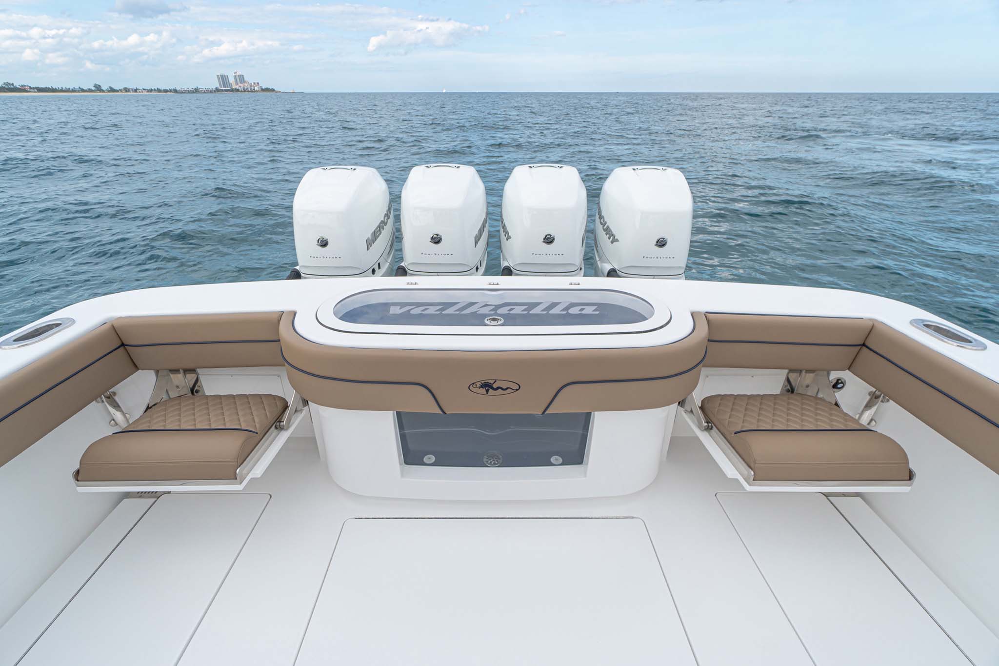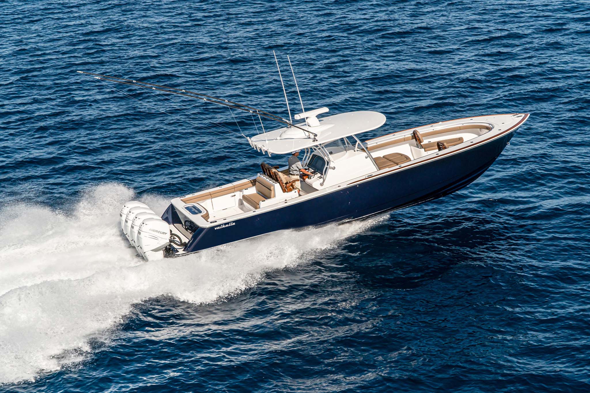 The V-41 Valhalla is a high-performance center console with options for quad or triple power setups, including Mercury 400s, 450Rs, or 300s, and Yamaha 425s. Joystick helm control with GPS station-keeping is available for all engine configurations.