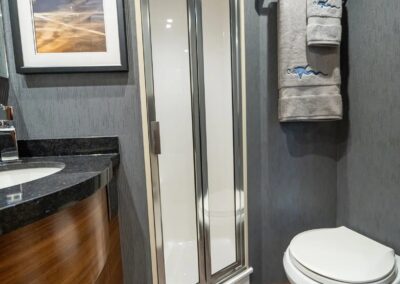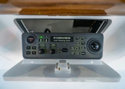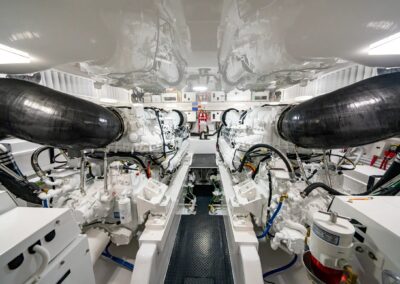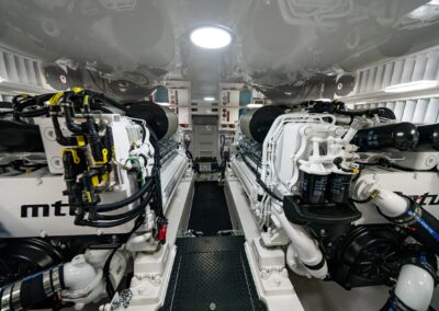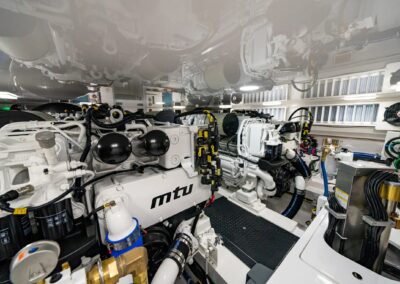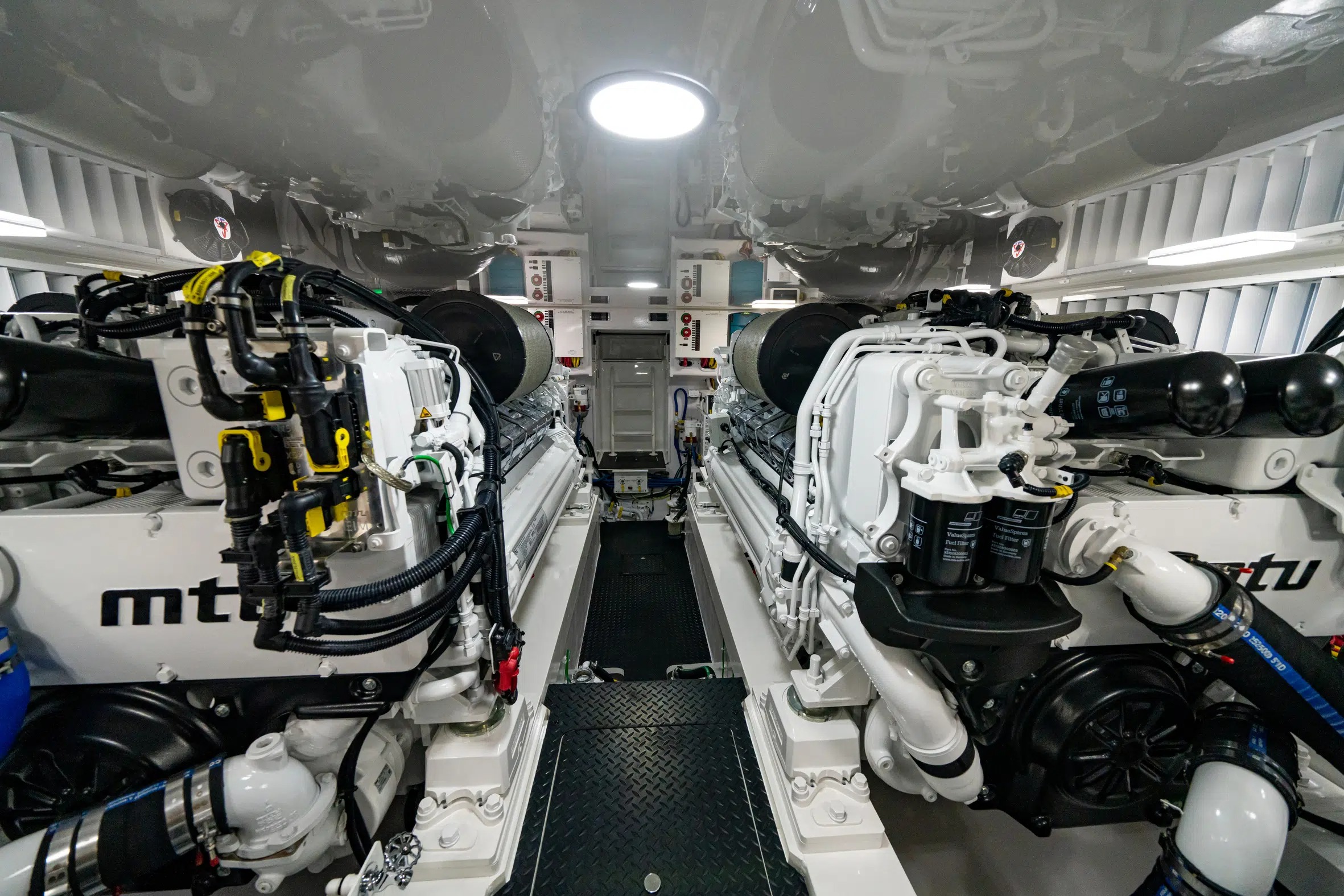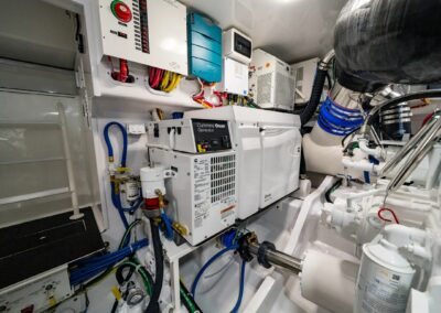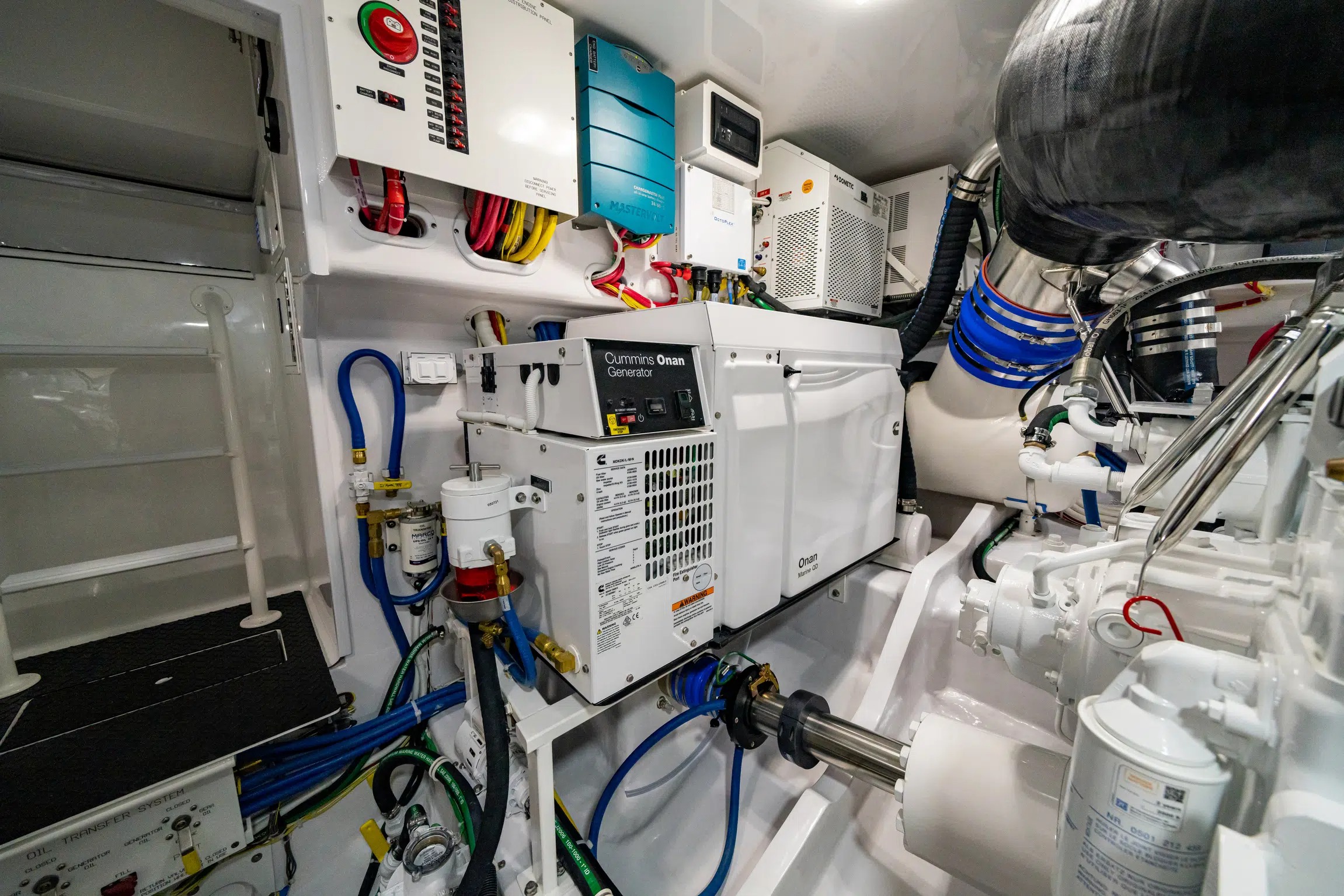 Ascend to the flybridge to find ample seating and storage, designed to maximize space. The electrical systems and engine room are outfitted with durable components, ensuring reliability and top performance.