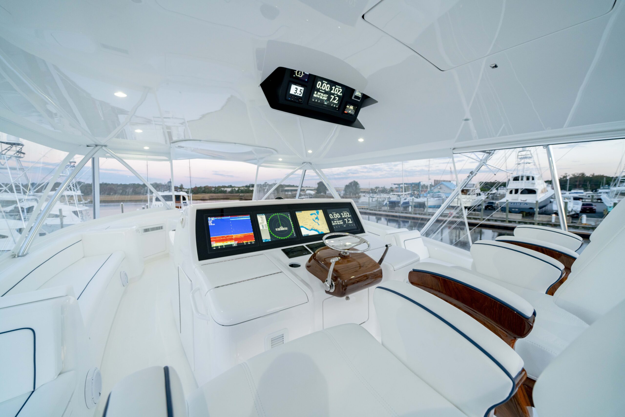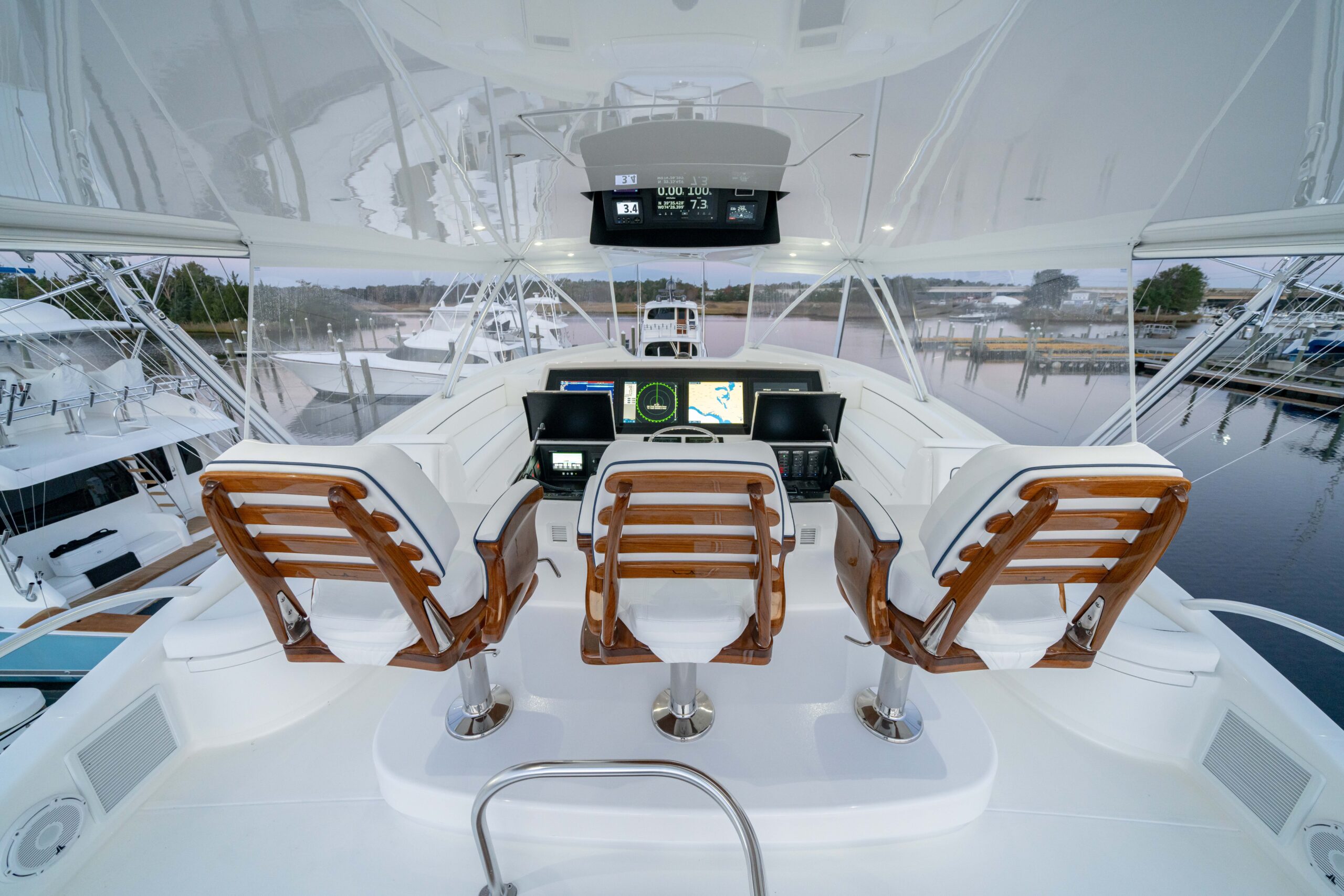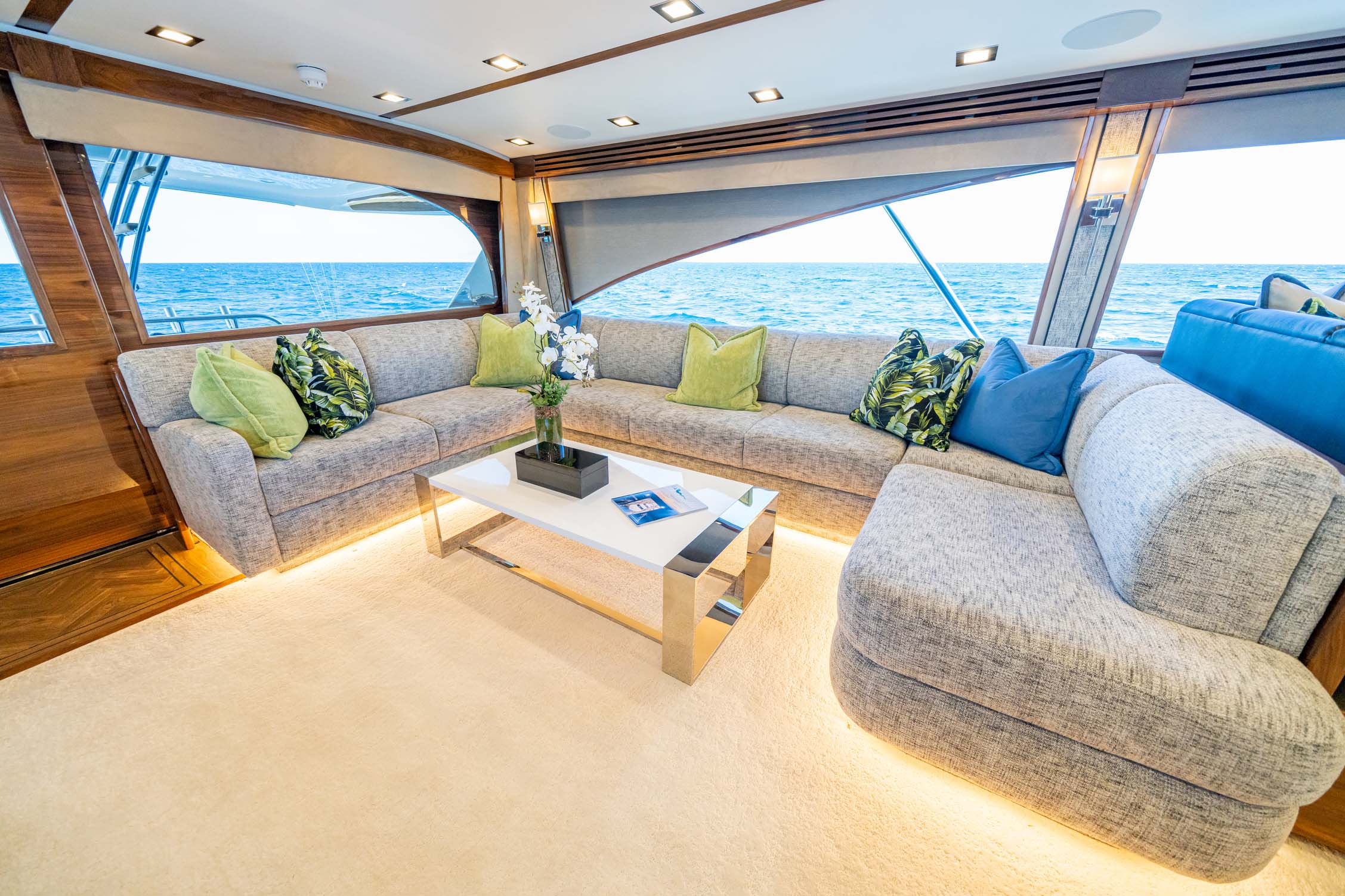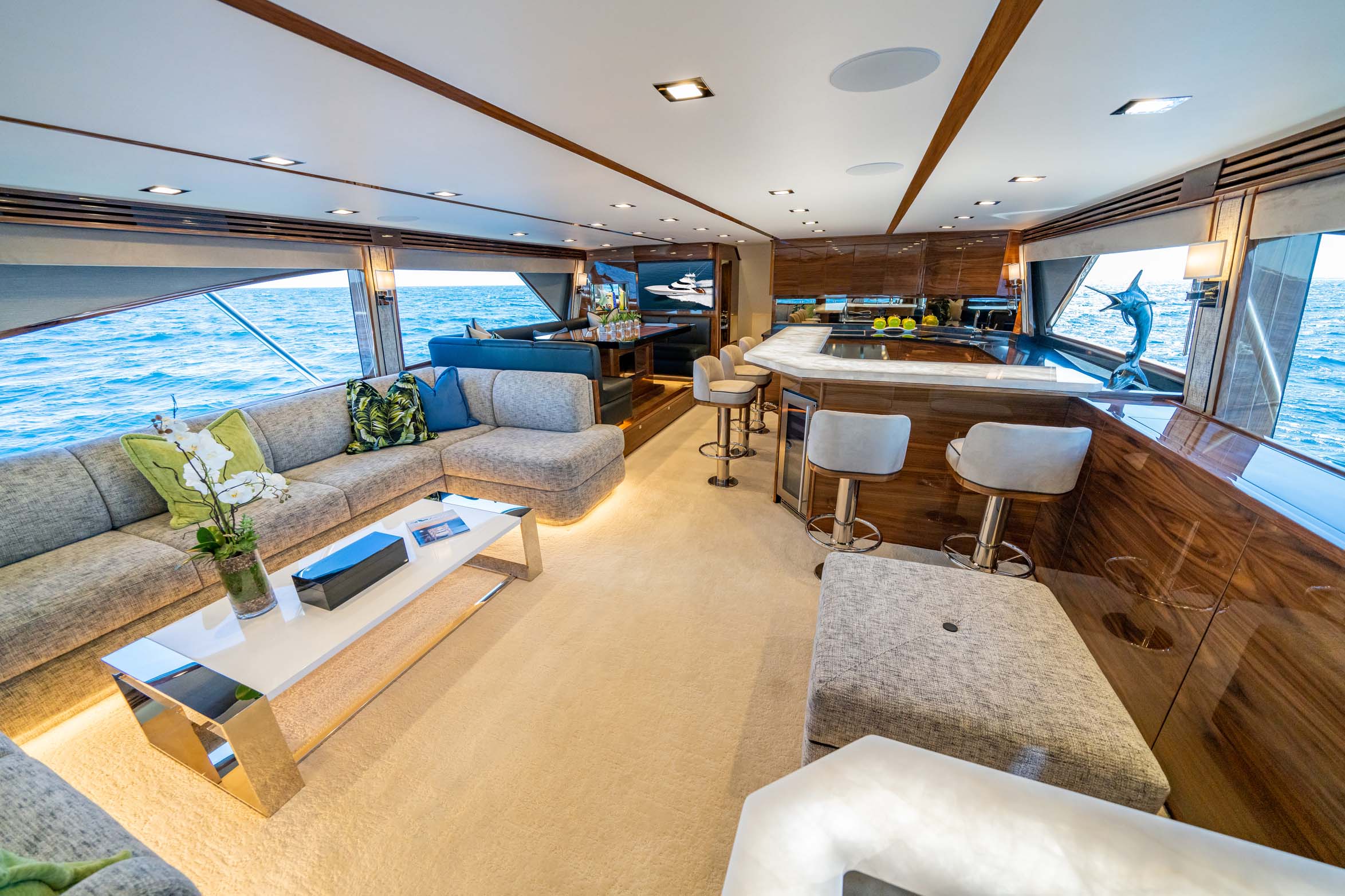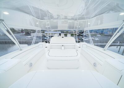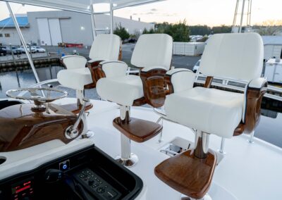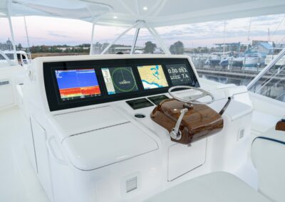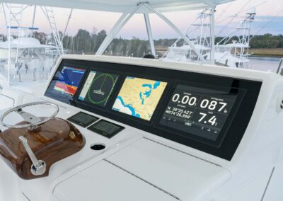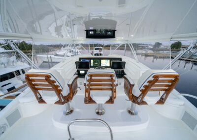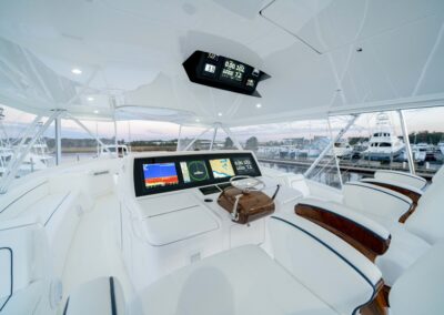 The cockpit measures 224 square feet, with a 203-gallon transom fishbox/live well and two 103-gallon in-deck fishboxes. Access to the Seakeeper 35 is provided by a powered hatch, and the cockpit is reinforced for a fighting chair, rocket launcher, or table.