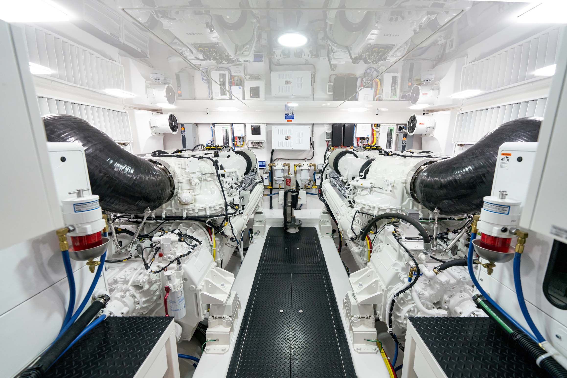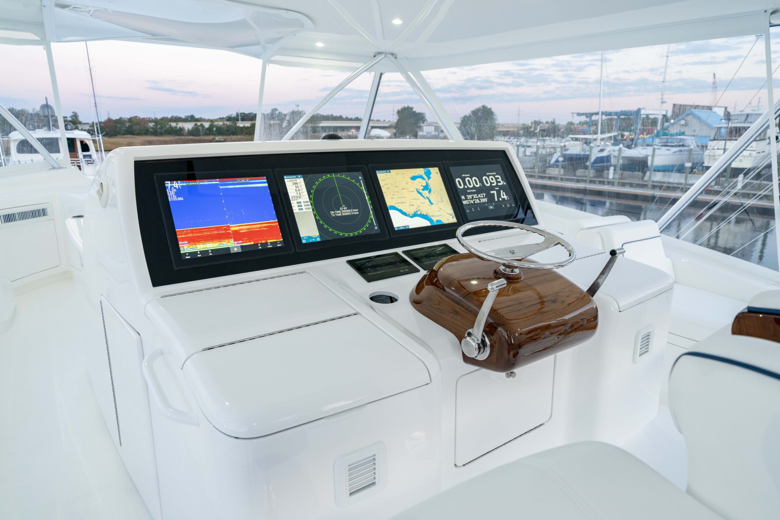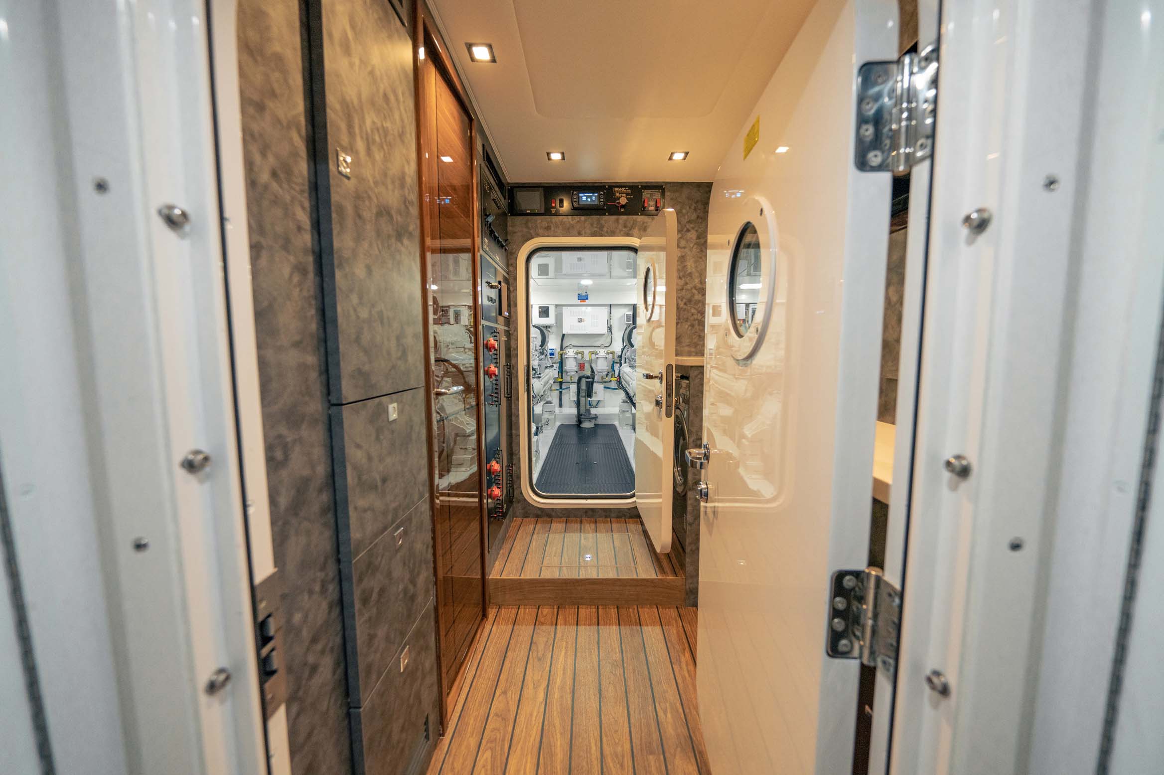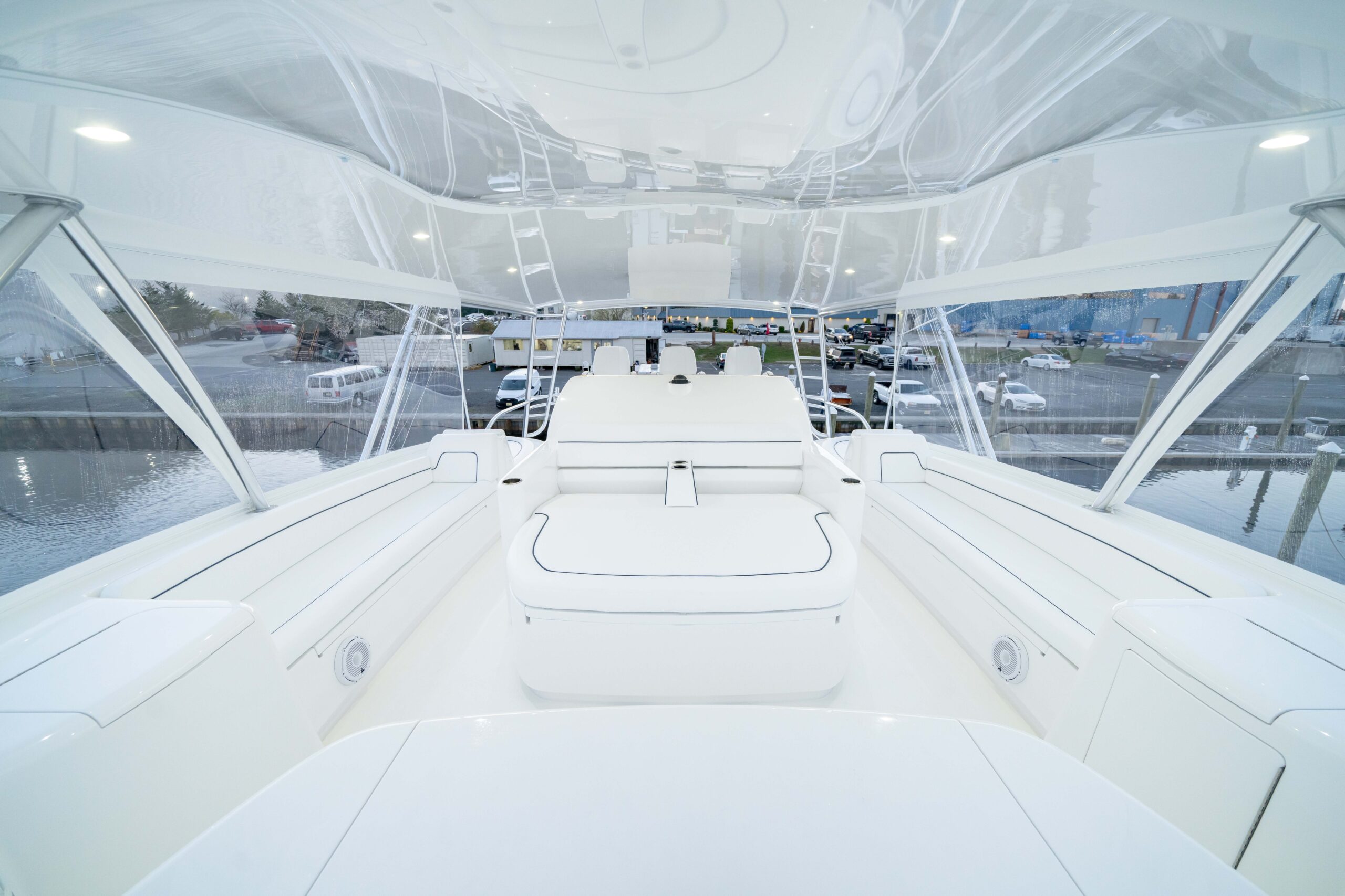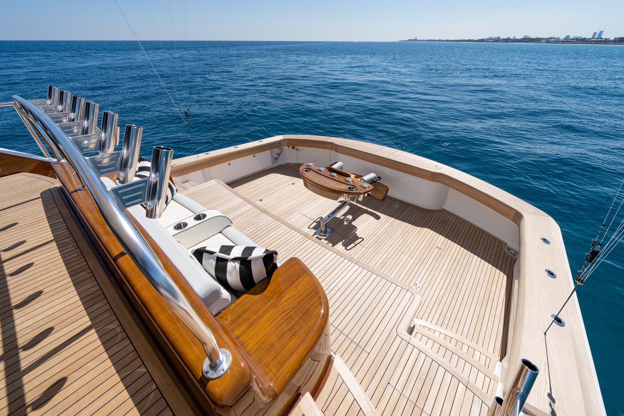The cockpit measures 224 square feet, with a 203-gallon transom fishbox/live well and two 103-gallon in-deck fishboxes. Access to the Seakeeper 35 is provided by a powered hatch, and the cockpit is reinforced for a fighting chair, rocket launcher, or table.
