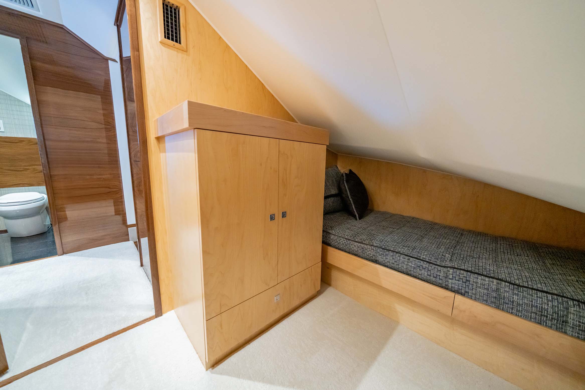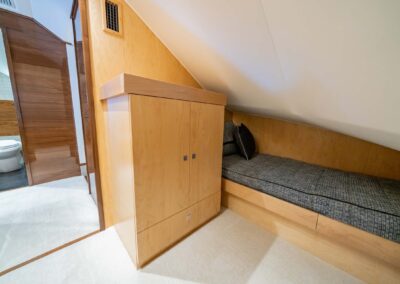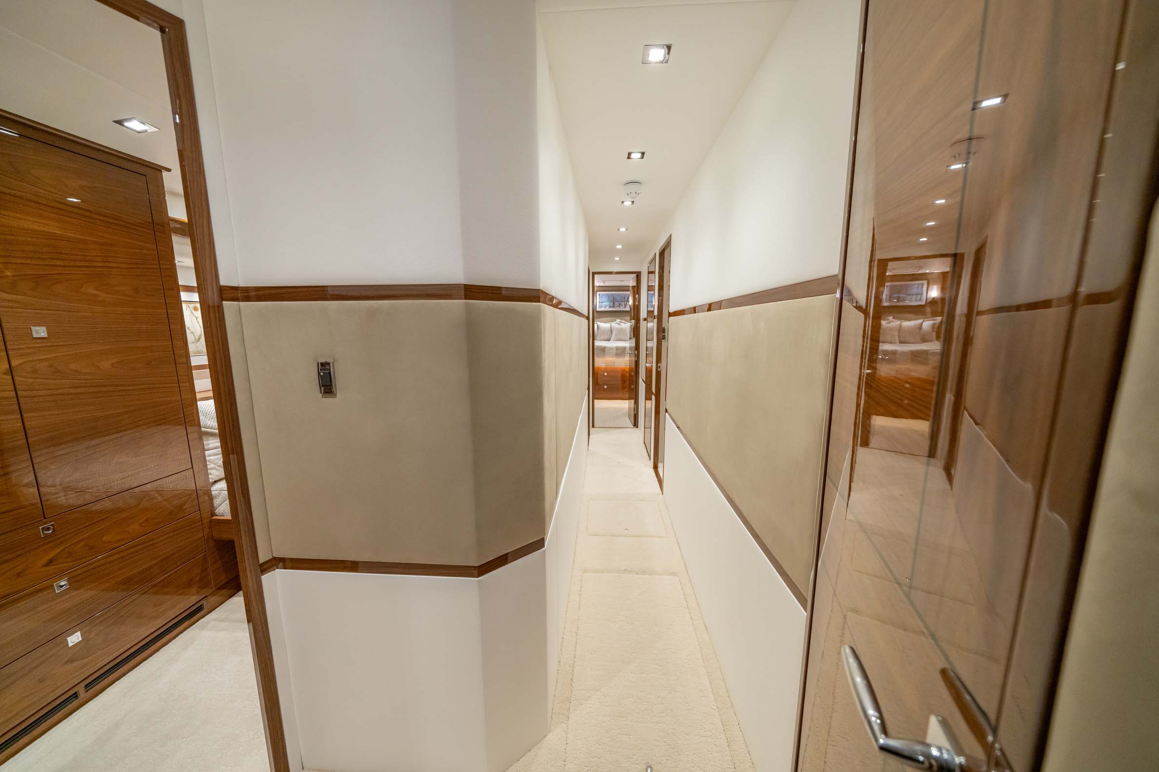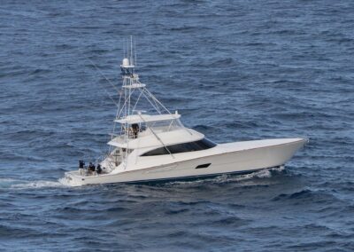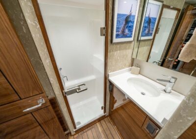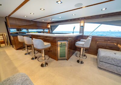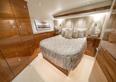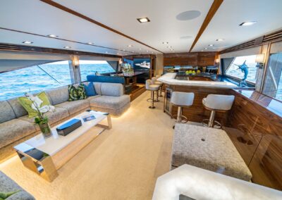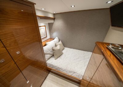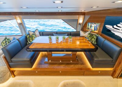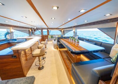 The interior of the Viking 90C boasts a spacious layout with a natural walnut finish, a lounge wrapping around the port side, and a starboard-side entertainment center with a 65-inch pop-up HD TV. The starboard wraparound galley is open to a raised U-shaped dinette with rod storage below. The Viking 90 Convertible offers five guest staterooms, each with a private head and shower, crew quarters with engine room access, a pantry with an additional crew berth, and a day head. The owner’s suite features a king walkaround bed, a walk-in closet, a dressing table, a lounge area, a full-size credenza with a 65-inch HD TV, and his-and-hers private facilities.