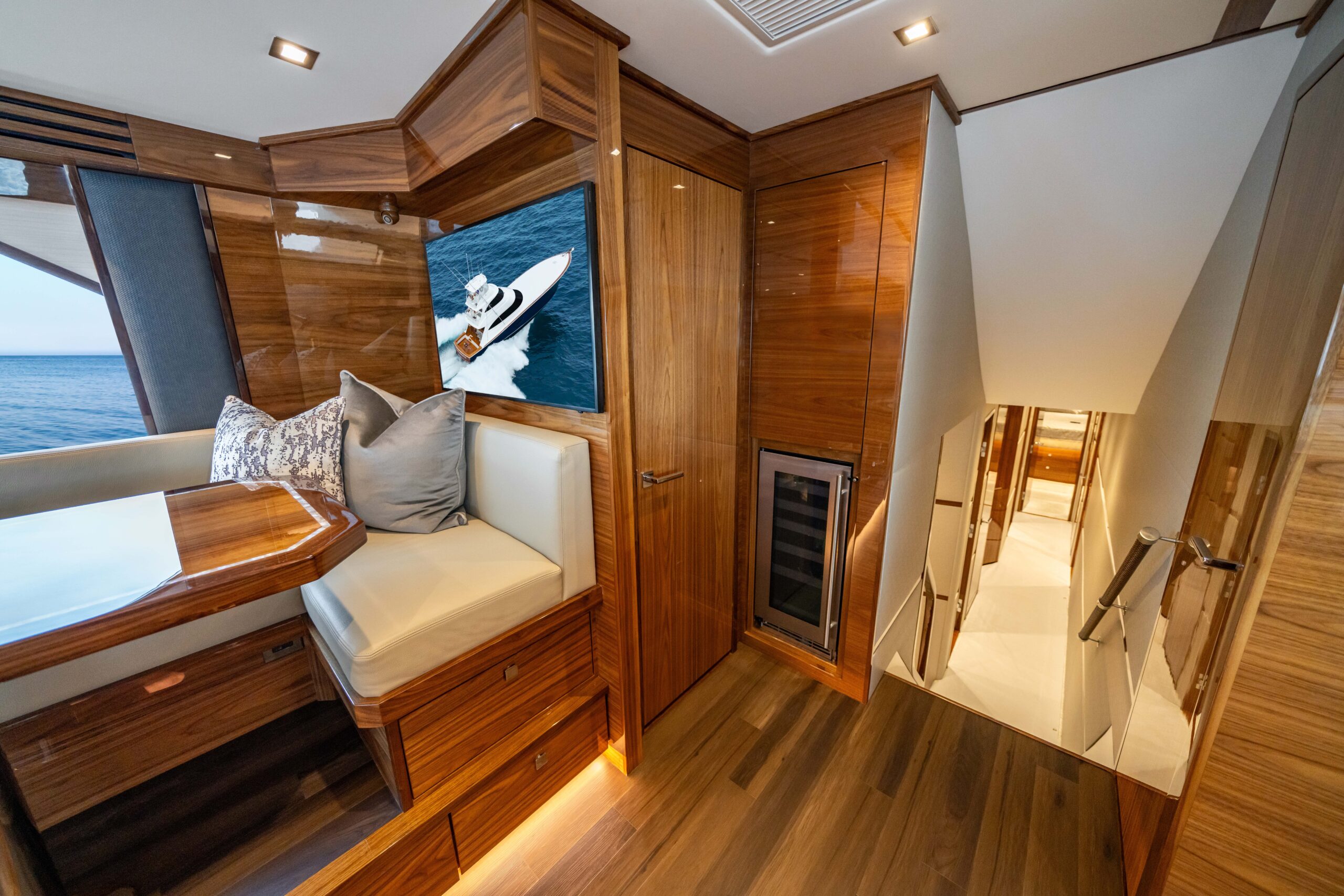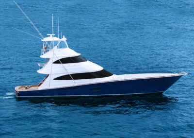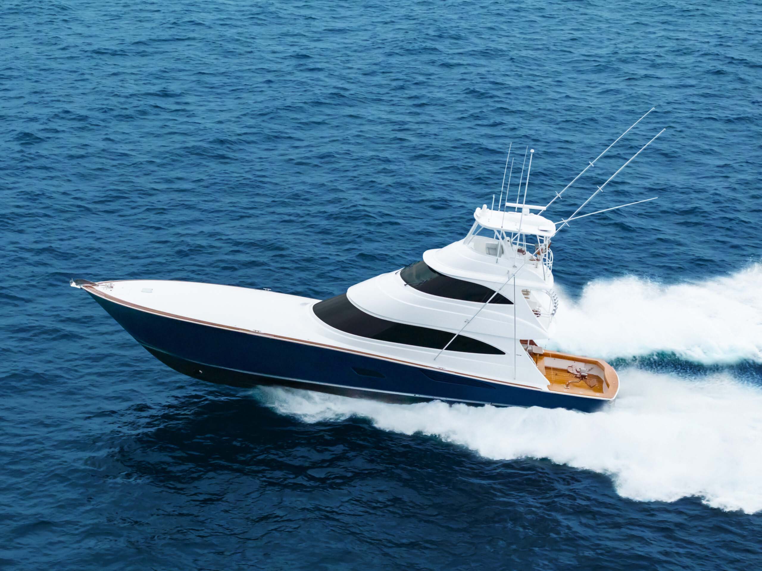 Experience luxury onboard the Viking 82 with stunning finishes, an open-concept layout, and five staterooms including a master suite. Amenities include a rod locker, laundry center, and crew stateroom for an elevated experience.