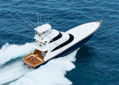 With a sleek design and exceptional performance, the Viking 82 Sky Bridge seamlessly integrates cutting-edge features like CFD optimization, the Advanced Viking Propulsion System, and an exhilarating top speed of 42 knots. By utilizing fiberglass and carbon fiber materials, the yacht achieves a perfect balance of strength and weight reduction, with a strong emphasis on enhancing overall construction quality through structural integrity.