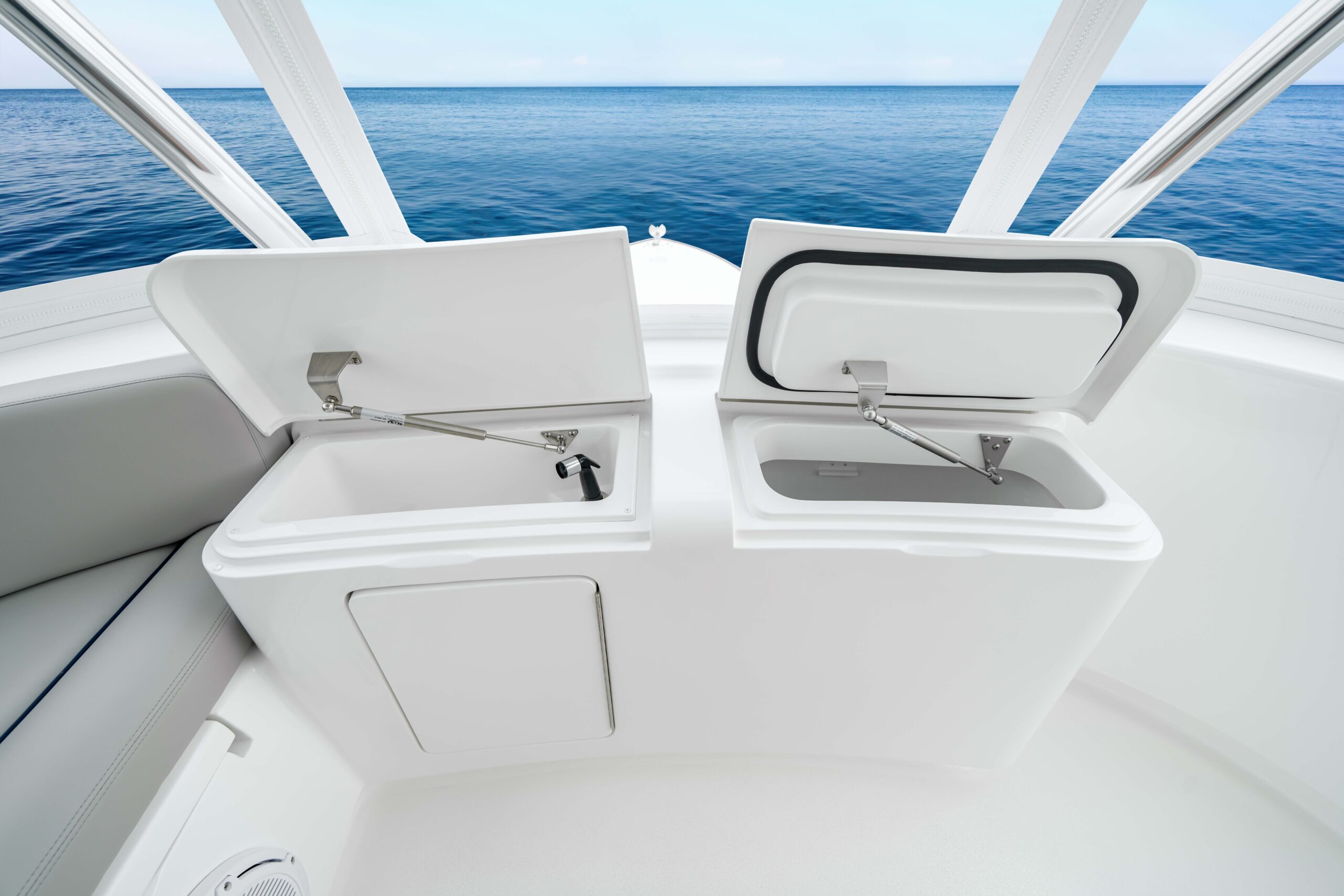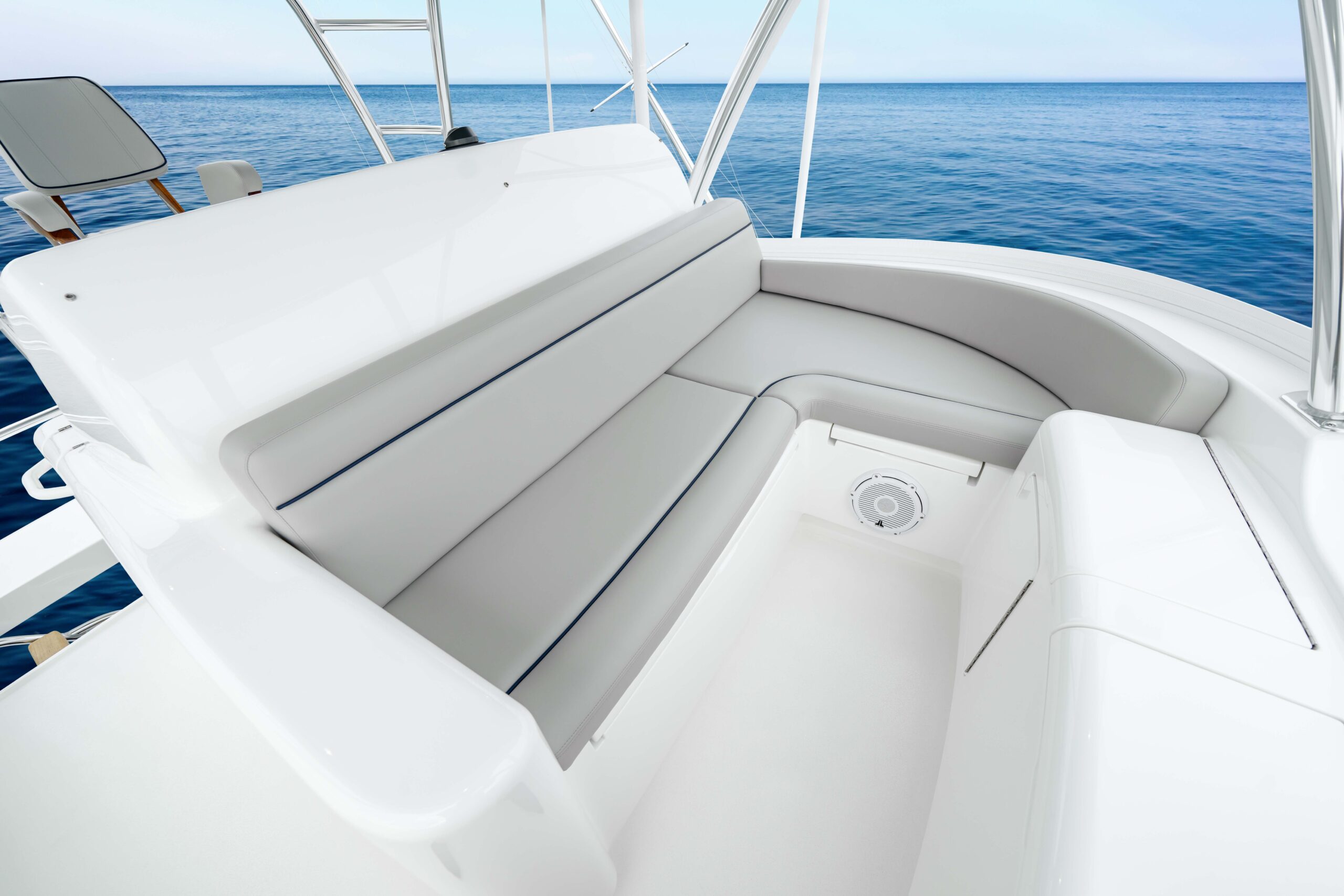 The sky bridge elevates the fishing and cruising experience with its panoramic 360-degree sightlines, ample seating options, and convenient amenities.
