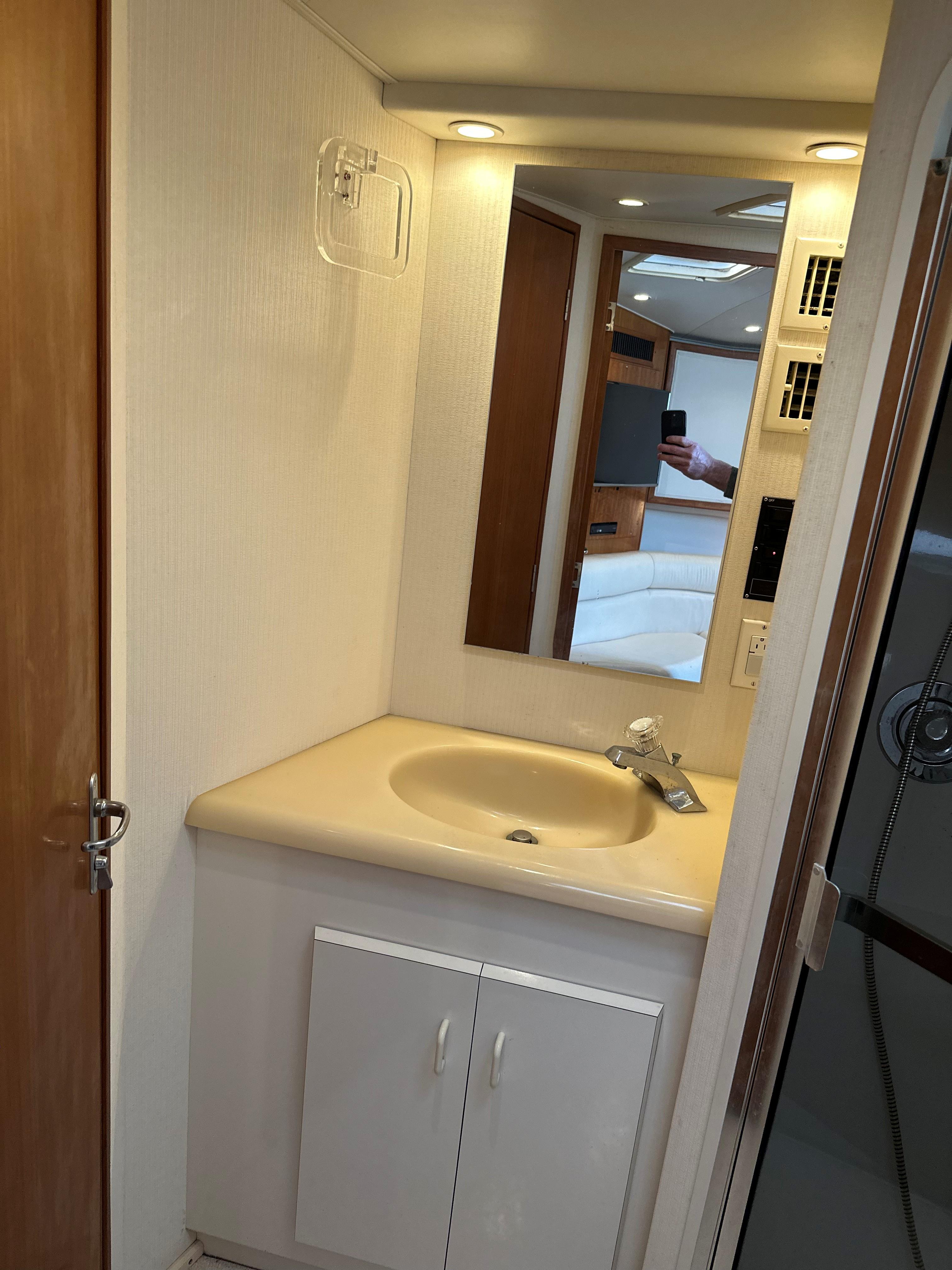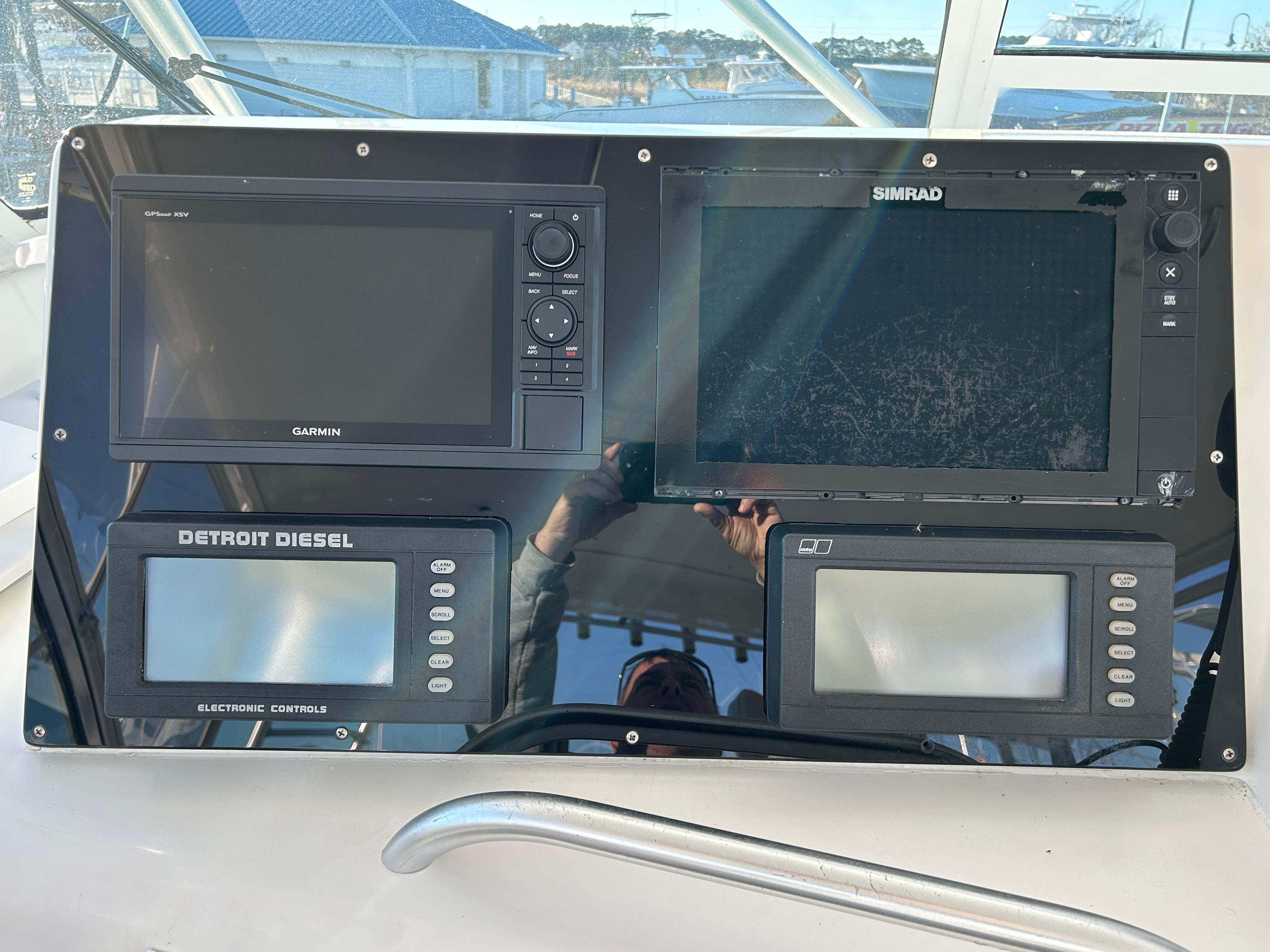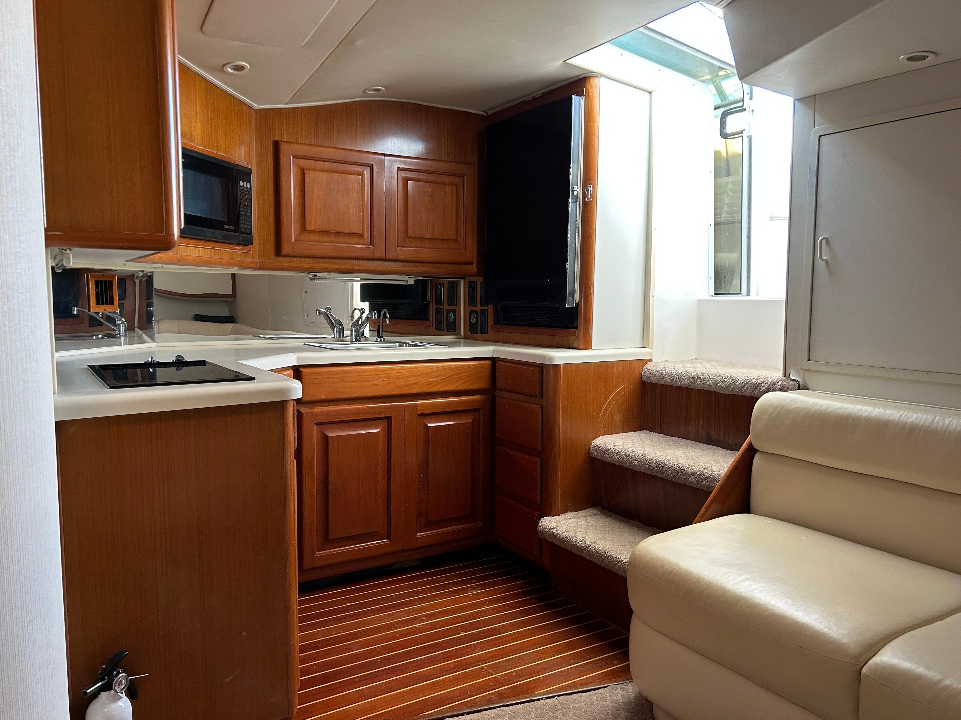 This 43 Viking has had many recent updates recently, most notably a Full Simrad electronics package. This is a very impressive sportfishing and cruising machine that is very easy to run. The bow rail was removed to improve visibility and make this one stand out from the crowd. A huge EZ2CY enclosed helm deck with air conditioning / heat make up the heart and soul of this Viking. The cockpit features a large livewell, floor fishbox, bait freezer, bait station, engine room access and a large Scopinich fighting chair with a 4 rod rocket launcher. A 3rd level pipe welders tower, with hard top and rupp outriggers round off the fishing features. But don’t forget the full kitchen with teak and holly flooring, complete head with separate stand up stall shower, large salon lounge seating area with hidden flip down bunk above the sofa, and full master with Queen island berth forward.